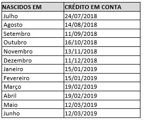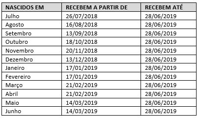 Quem nasceu de julho a dezembro, recebe o benefício ainda este ano. Já os nascidos entre janeiro e junho, terão o recurso disponível para saque em 2019 (tabela abaixo). Em qualquer situação, o dinheiro ficará à disposição do trabalhador até 28 de junho de 2019, prazo final para o recebimento.